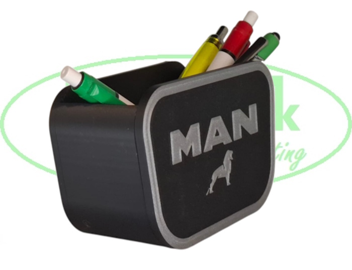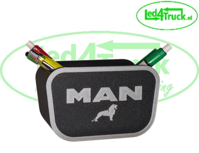 Deze M.A.N pennenbakje is eventueel in andere kleuren ook verkrijgbaar. Hoogte: 7.6 cm Breedte:12 cm diepte: 6 cm Pennenvak is een rechthoek 10.3 cm bij 5 cm